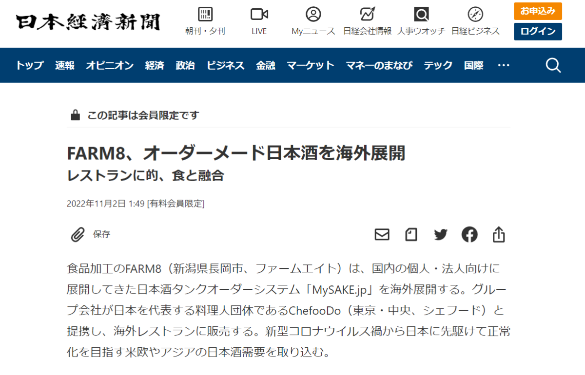 日经新闻等刊登了本公司FERMENT8株式会社和日本酒订购系统“MySAKE.jp”发展面向海外的餐厅的报道。 〇刊登媒体 日本经济 …